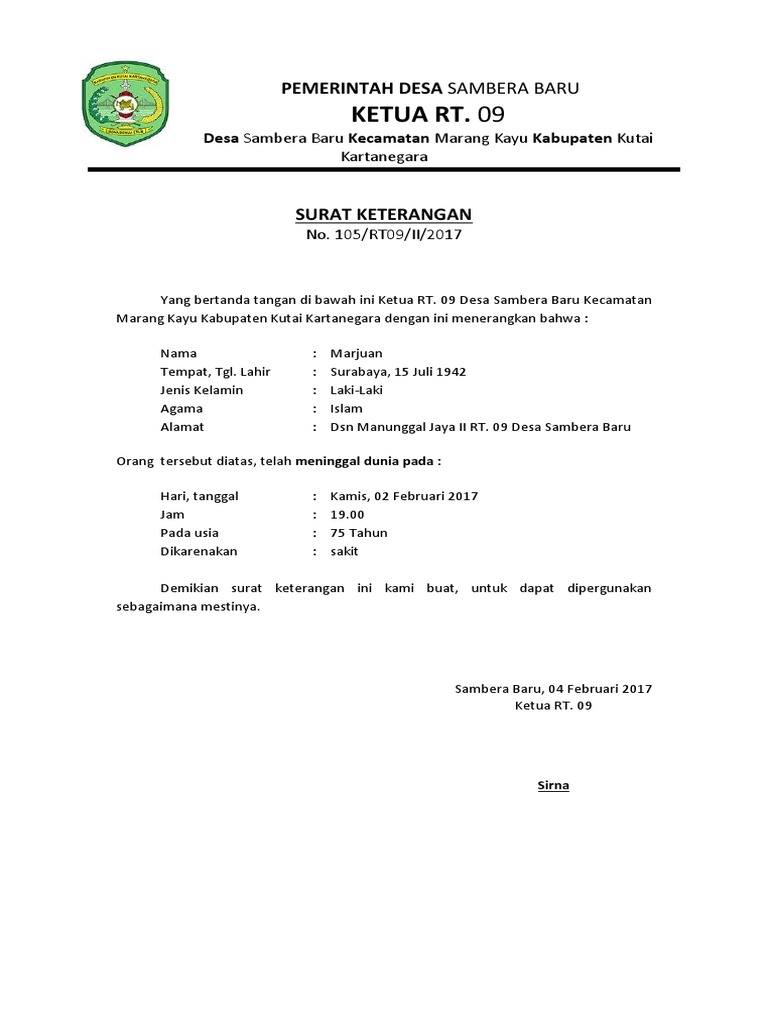 Home » contoh surat » contoh surat keterangan kematian dari rt. Mengetahui, rt.004 lingkungan i kelurahan durian payung. Rs karya medika jakarta jl. Shintya devi kusuma ayu alamat : Surat keterangan ini adalah kebalikan dari surat keterangan lahir yang sebelumnya telah kami ulas yang menjadi salah satu syarat administrasi dalam pengurusan akta kematian. Dengan surat kematian ini, saya yang bertanda tangan, ketua rt 02 rw 03 desa merpati kecamatan nuri kabupaten gagak, menerangkan bahwa Demikian surat keterangan kematian kami buat dengan sebenarnya untuk dapat dipergunakan sebagaimana mestinya. Dan untuk kali ini saya akan share contoh surat keterangan kematian yang dibuat oleh rt yang diketahui juga oleh ketua rw. Surat keterangan kematian dapat diterbitkan melalui beberapa proses. Pemerintah kabupaten klaten kecamatan jatinom kepala desa bandungan jln. Contoh surat balasan penelitian dari sekolah. 57 rt.05/rw.03, cempaka hitam, bandung barat. Surat keterangan kematian ini biasanya dibuat ileh desa, rt/rw dan juga sering dibuat oleh dokter.
